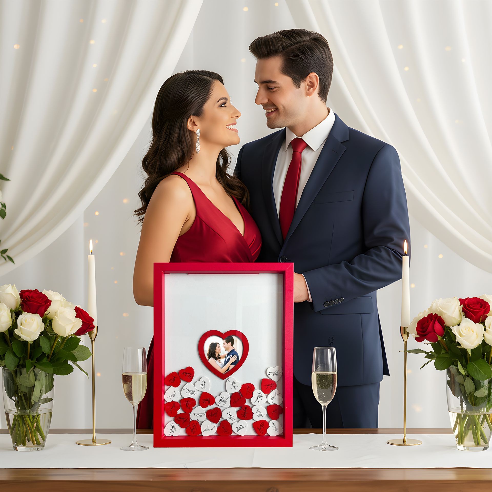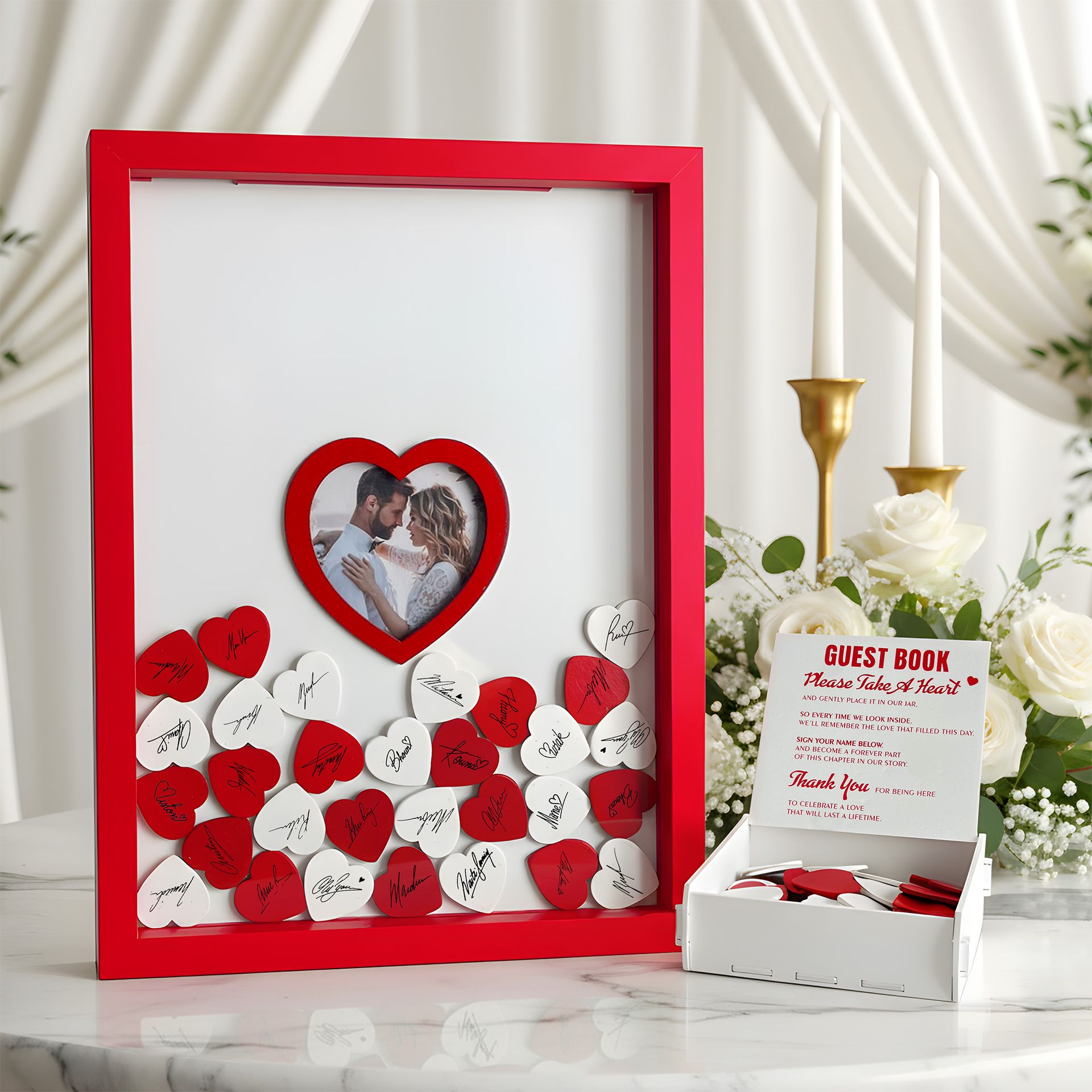 Imagine this: your guests, smiling as they write heartfelt messages on soft red and white wooden hearts, then delicately place them in an elegant frame. With each heart added, the guest book transforms into a beautiful mosaic of love and good wishes. Instead of fading into obscurity, the guest book becomes part of your wedding décor and, later, a part of your everyday life as a framed memento of that magical day.
